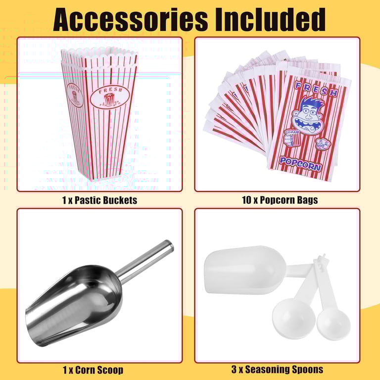 Suministros de palomitas de maíz incluidos: Esta máquina de palomitas de maíz de cine incluye suministros de acero inoxidable para servir y 50 bolsas de palomitas de maíz. Los accesorios de acero inoxidable incluyen una taza medidora de 1/2 taza, cucharada, cuchara de palomitas de maíz y salero.