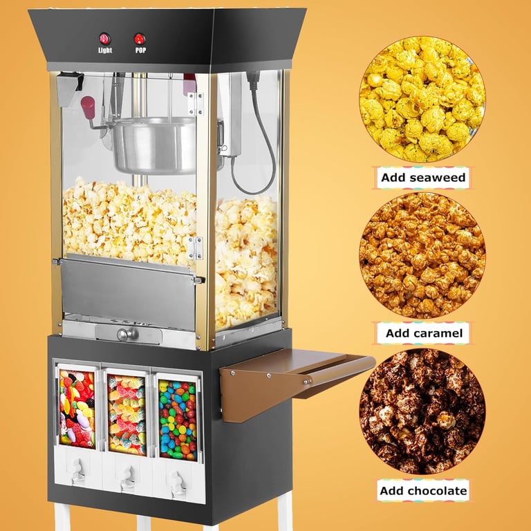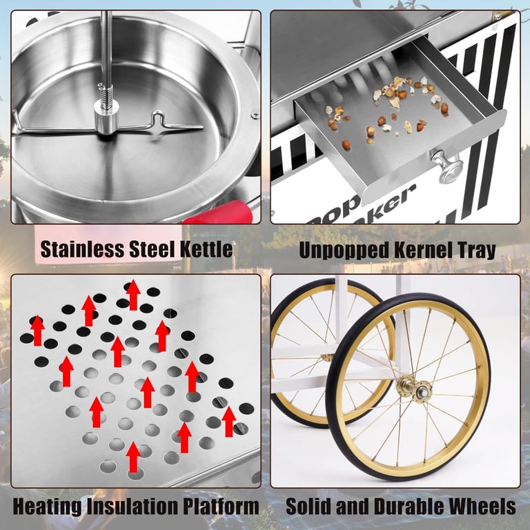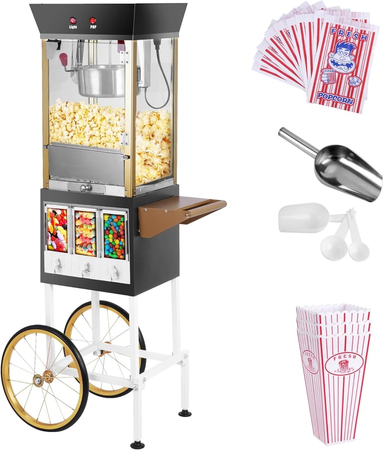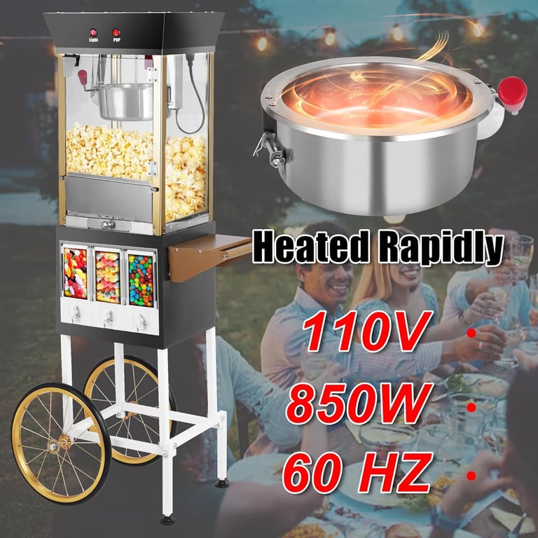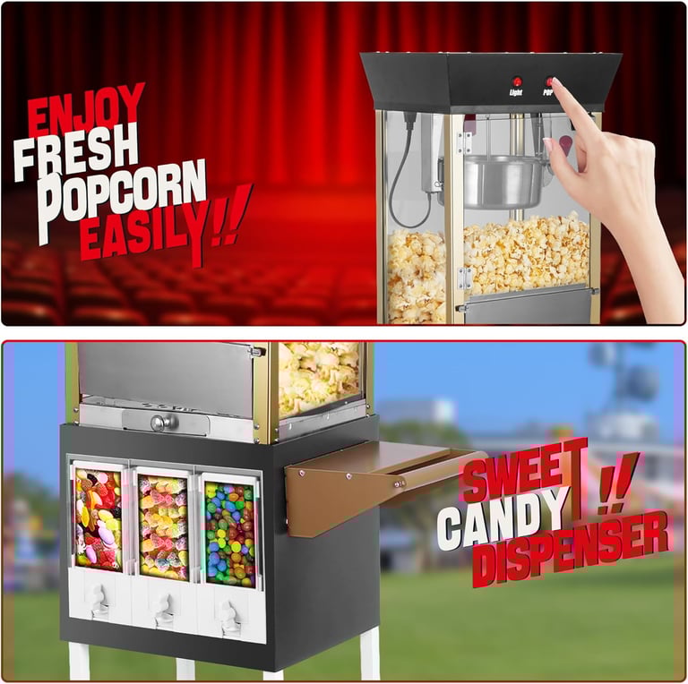 Máquina de palomitas de maíz de alta calidad: esta máquina de palomitas de maíz con carrito está construida para durar. Está fabricado con materiales altamente duraderos, incluyendo acero recubierto de polvo resistente y zonas alimentarias de acero inoxidable. Disfruta de palomitas de maíz continuas con la máquina de 850 vatios de calidad comercial con motor silencioso. Dimensiones totales: 20-1/2" W x 17-1/2" D x 54" H.